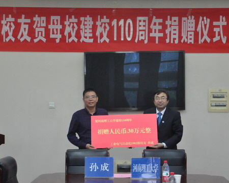 仪式伊始,邵强在致辞中首先向孙成校友荣归母校表示热烈的欢迎,并对孙成校友的慷慨捐献表示衷心的感谢。随后,邵强介绍了河南理工大学的发展历史、师资力量、学科设置、荣誉成就等方面。同时也向师生代表介绍了孙成校友取得的成就与荣誉。长期以来,孙成校友关心母校发展,现捐赠30万元,设立“孙成奖学金”,用于奖励MK体育 的优秀学生,这充分彰显了孙成校友饮水思源、感恩母校的高尚情怀,是全体师生学习的榜样。邵强主任也告诫在校大学生,要谨记校友回馈母校的高尚品德,继续努力,成为一个对母校、对社会有用的栋梁之材。
